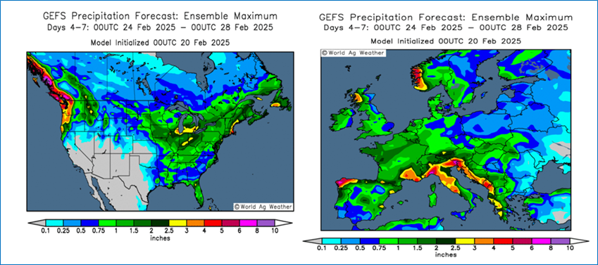 Temperaturile vor crește în acest weekend în SUA și Canada, dar temperaturile minime de peste noapte sunt de așteptat să rămână sub pragul de înghet în următoarea perioadă în unele regiuni cultivate cu grâu de iarnă. Majoritatea zonelor sunt în general protejate în acest moment cu acoperire adecvată de zăpadă, ceea ce ar trebui să limiteze preocupările de deteriorarea culturilor. În Rusia se vor menține temperaturi scăzute în medie de -10°C dar lipsa umidității continuă să fie problema pentru culturile de iarnă, fără prognoză de precipitații pentru perioada următoare. Vremea din India rămâne caldă și uscată, afectând cultura de grâu a țării.