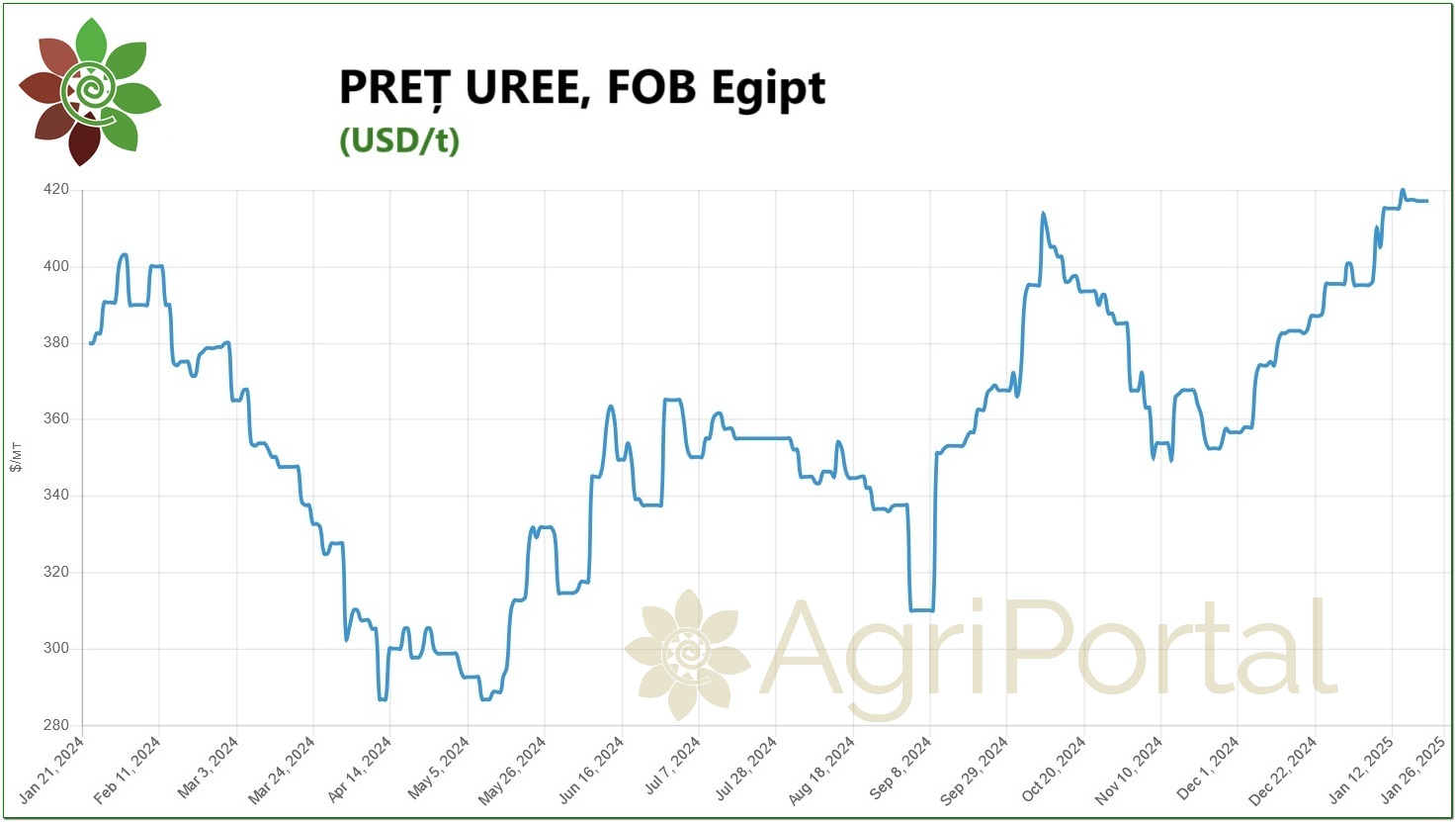 Prețurile ureei continuă să crească puternic și se pare că această tendință va continua cel puțin în viitorul apropiat. De asemenea, se poate aștepta o creștere a prețurilor la îngrășămintele cu potasiu, în special în SUA, dacă noua Administrație Trump va anunța potențiale tarife. În urma lipsei unei oferte suficiente, combinată cu cererea slabă, prețurile la fosfat prelucrat se așteaptă să mențină nivelurile actuale ale prețurilor în viitorul apropiat, iar amoniacul poate fi unul dintre puținele produse care simte presiunea prețurilor, ca urmare a ofertei abundente și a cererii slabe.