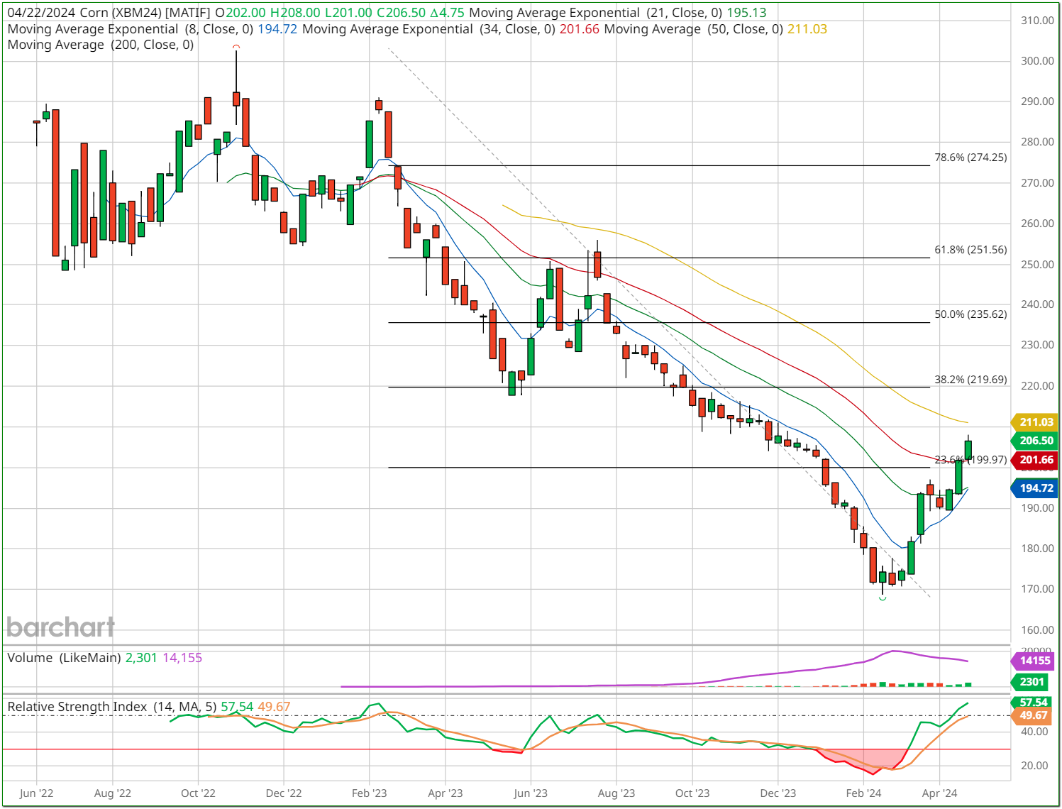 După o consolidare de patru săptămâni sub 200 EUR/t/pentru recolta nouă, sentimentul bulish al pieței din Paris a preluat ieri pragul psihologic mult așteptat și, fără îndoială, următoarea țintă va fi 210 EUR/t, unde ar trebui să întâmpine o rezistență mai serioasă. Vestea importantă din această săptămână este că prima prima pentru contractele futures pentru culturile vechi este, spre deosebire de grâu, deja mai scumpă decât pentru noua recoltă. Un posibil îngheț care au putea afecta noua recoltă de porumb recent însămânțată în Europa(și nu numai)  și necesitatea re-cultivării acesteia va fi factorul fundamental în susținerea prețului Matif. Sursa diagramei Barchart.