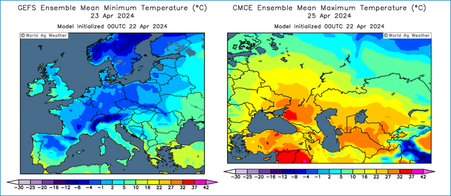 Precipitațiile deja excesive din Argentina vor continua să dăuneze recoltelor și să întârzie recoltarea în săptămâna viitoare. Ploi abundente și în sudul Braziliei, dar în nord va fi aproape complet uscat pentru a doua recoltă de porumb (cultura safrinha). De asemenea, vor fi ploi abundente și larg răspândite în Centura de porumb din SUA, ce vor întârzia semănatul, dar vor fi binevenită pentru ceea ce a fost deja cultivat. După condiții aproape de iarnă, vestul Europei se va încălzi și ploaia va continua. Cu toate acestea, rămâne de clarificat în ce măsură temperaturile negative au deteriorat (distrus) ceea ce a fost deja semănat și cât de mult va trebui (poate) re-semănat. După ploile mult așteptate, umiditatea solului din sud-estul Europei își revine, dar Rusia rămâne uscată și fierbinte.