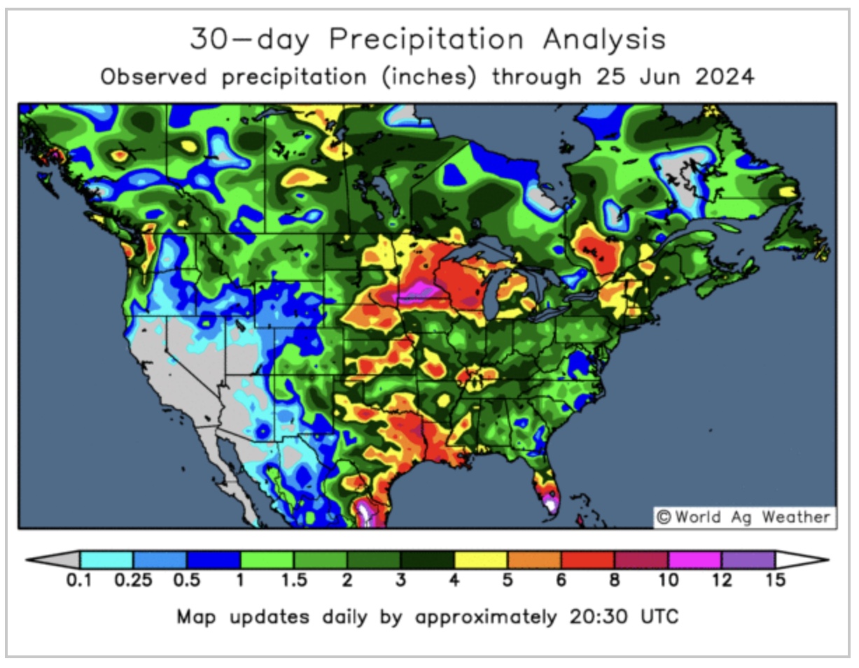 În SUA, Asociația Națională a Procesatorilor de Semințe Oleaginoase a raportat o revenire a volumelor de soia zdrobită pentru luna mai, marcând o creștere de 8,4% față de aprilie și o creștere de 3,2% față de an. Plantarea de soia a progresat bine, cu 93% plantate până la mijlocul lunii iunie, deși condițiile de recoltă au scăzut ușor la 70%, evaluate ca bună până la excelentă.