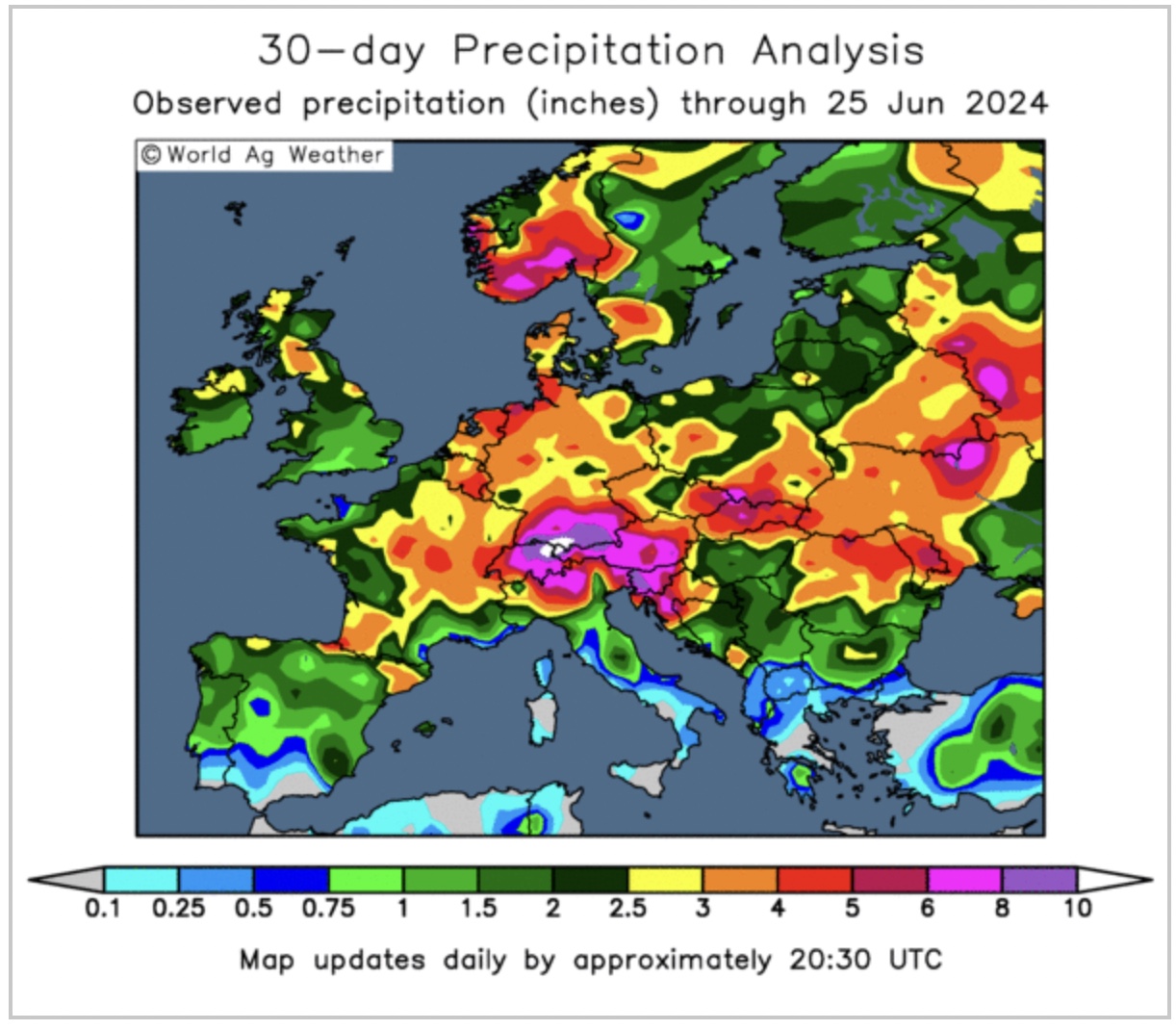 Luna iunie a acestui an este mai răcoroasă decât de obicei cu 3,2 °C în Europa, cu temperaturi medii de 19,6 °C comparativ cu norma istorică. La începutul lunii, temperaturile au început de la 18,3 °C evoluând către o medie de 23,4 °C până la sfârșitul lunii. Precipitațiile - moderate, cu o medie de 8 zile ploioase.