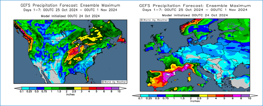 În Europa, vremea umedă nefavorabilă însămânțării de toamnă va continua, mai ales în nord-vest  iar zonele de est s-ar putea recupera după o perioadă umedă. La Marea Neagră, deficitele de precipitații sunt foarte mari și fereastra pentru înființarea grâului de iarnă s-a închis, iar înghețurile devin mai probabile de acum înainte. Condiții generale mai uscate sunt prognozate pentru următoarele două săptămâni, cu mai multe fronturi deplasându-se cu averse foarte limitate și scăderi mai mari ale temperaturii.