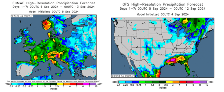 Temperaturile mai calde din vestul SUA vor persista și săptămâna viitoare și ar putea provoca o creștere a secetei în timp ce în Câmpiile Centrale/Sudice vor cădea precipitații înainte de semănarea grâului de iarnă. Condițiile recente calde și uscate din Preriile Canadei au fost favorabile pentru continuarea recoltei de grâu. Argentina rămâne foarte uscată pentru dezvoltarea grâului iar săptămâna viitoare vor cădea precipitații doar pentru zonele nordice. Un front atmosferic a adus averse împrăștiate în Europa de Vest în timp ce zonele estice sunt foarte calde, neprielnice pentru semănatul timpuriu al culturilor de iarnă. Un sistem slab în Marea Neagră a adus averse limitate dar ploile vor continua până la sfârșitul acestei săptămâni.