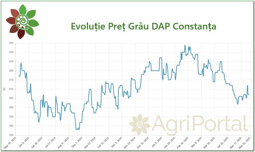 Grâul românesc 11,5% din vechea recoltă este oferit la 239 USD/t FOB Constanța, în scădere cu 2,44% față de luna aprilie, aproape la aceeași paritate cu grâul din Ucraina, în timp ce grâul 12,5% este oferit la 244 USD/t FOB.